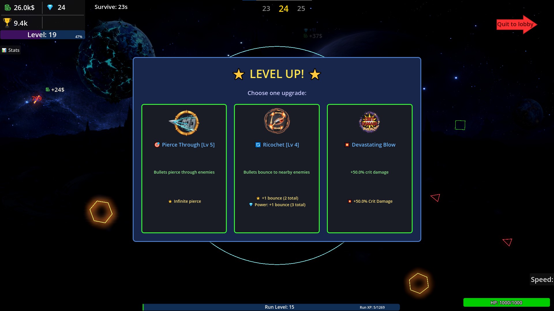 In this space rogue-like shooter, you control a static ship facing waves of enemies. Each round offers new upgrades and abilities, such as ricochet or explosive shots, that help you survive and progress through further waves. As you face increasingly stronger enemies, you'll need to adapt your tactics and make the most of every upgrade to your advantage. Enjoy dynamic combat and endless possibilities for improvement!